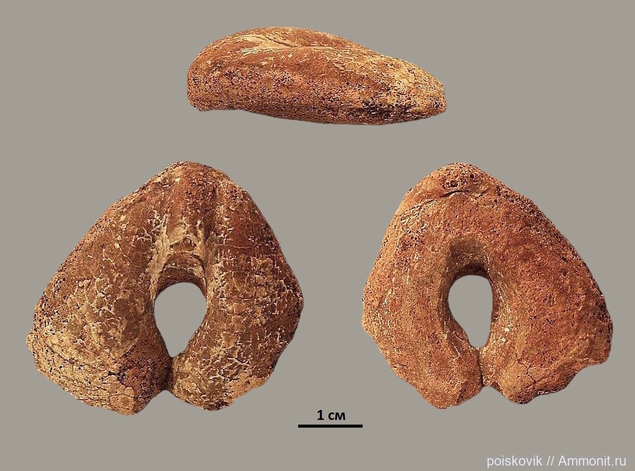 Брахиопода из красных глинистых известняков Верхоречья (баррем). Размеры: 3,4см Х 3см Х 1,2см. В отличие от предыдущей Pygope - отверстие сквозное.