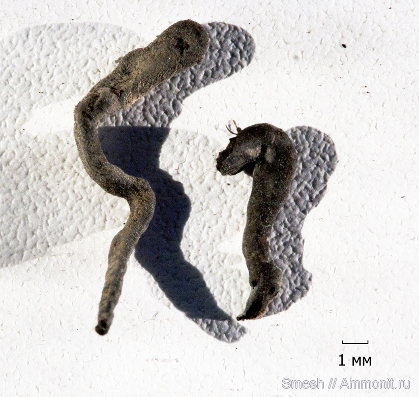 Белемниты их называют именно "призраки" белемнитов в Еганово :) как мне пояснили, белемнит растворился, а пустота заполнилась породой, так и сохранился такой "призрак", а серпула - это может быть и был ход червя, как вариант внутри вновь заполненной породы? | ||||||