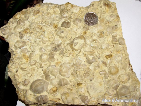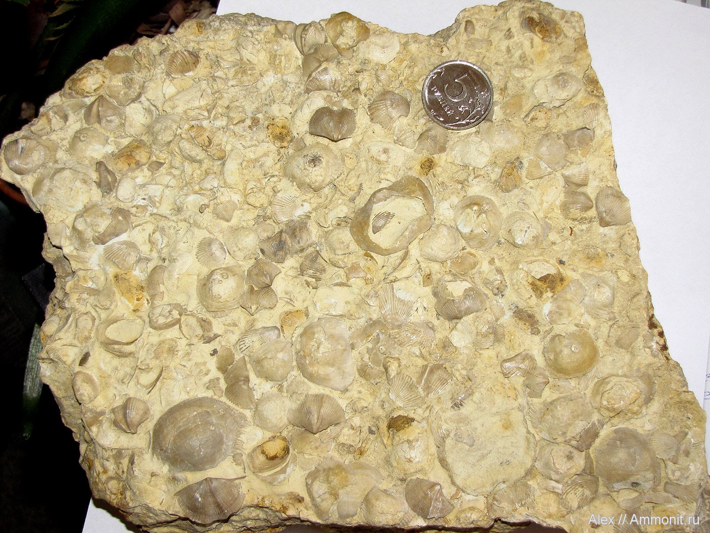Известняковая плита со множеством раковин брахиопод. Своеобразная брахиоподовая мостовая. Размер плиты приблизительно 20х20 см.