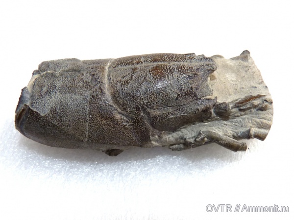 "Поймал" я его у одного коллекционера в Кисловодске. Нашёл бы сам - радовался бы больше. Не креветка вроде бы по строению. Но с современными речными раками есть различия, специально сравнивал, положив два панциря рядом. Ноги, наверное, можно еще очистить. С брюшной стороны не особо интересный вид, интересны разве только обломанные после первого сегмента клешни. Размер образца невелик: 5,2*2,5см. Насчет редкости - не уверен, что это такая уж редкость, местонахождений в литературе немало описано, хоть я и не был ни на одном. Вот целые мангышлакские или итальянские крабы - вот это зрелище! | ||||||