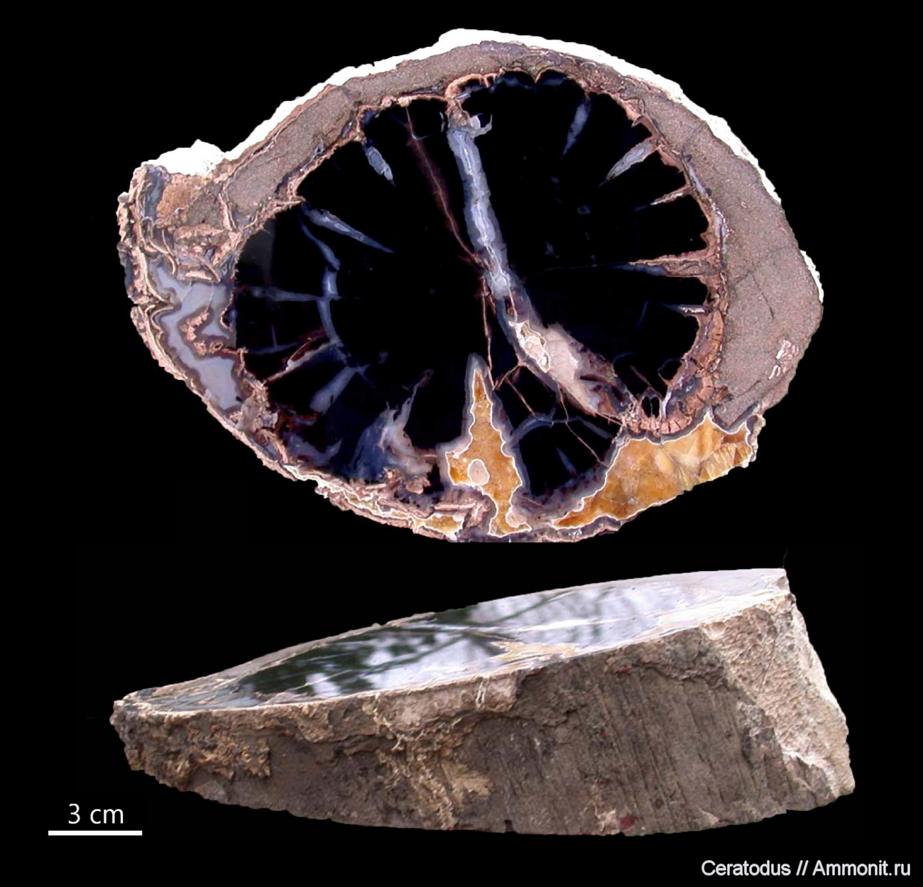 Трещины и ходы насекомых заполнены голубым агатом или кальцитом золотистого цвета. Этот кусок был отрезан от конца ствола и имеет различную толщину.