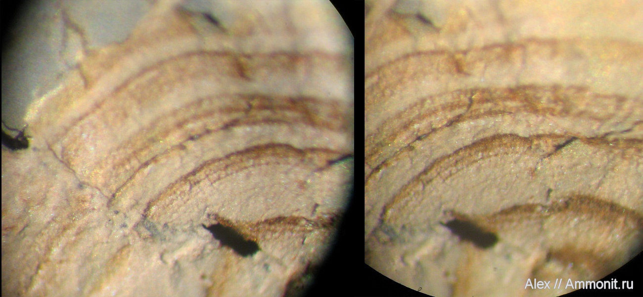 Под микроскопом четко видно, что эти круги представляют собой борозды. Борозды довольно глубокие, с внутреннем рельефом из меньших борозд. Раковина в этом месте немного промята и деформирована, заметны несколько трещин.
