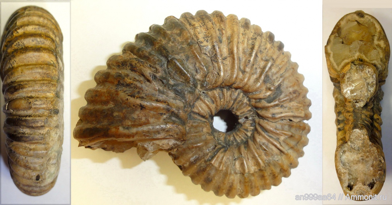 аммонит Colombiceras ? похож на Tobleri ?, при расчистке серединки было обнаружено что пупок отсутствует, сначала подумалось что этот экземпляр что-то "типа аммонитоцераса" Пример обработки аммонита. Сторона 1 т.к. ребра свободно заходят на умборальную сторону, но все таки по видимому он в незапамятные времена был немного сплющен, перекручен и пупок выпал, получен в собственность благодаря Омару, мах размер 7,6 см, внутри заполнен крупными кристаллами кальцита через которые свободно проходит сифон