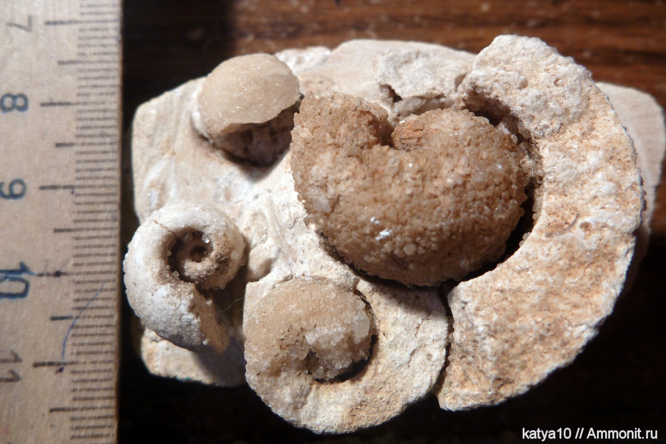 Вот и этот беллерофон, хоть и один из многих на сайте, но он интересен, во-первых, тем, он не один, а, во-вторых, он покрыт кристаллами кальцита. А тот, что был найден мной в Домодедово - кристаллами кварца. Ruslan69 препарировал этот образец, так что он предстал перед нами во всей красе.