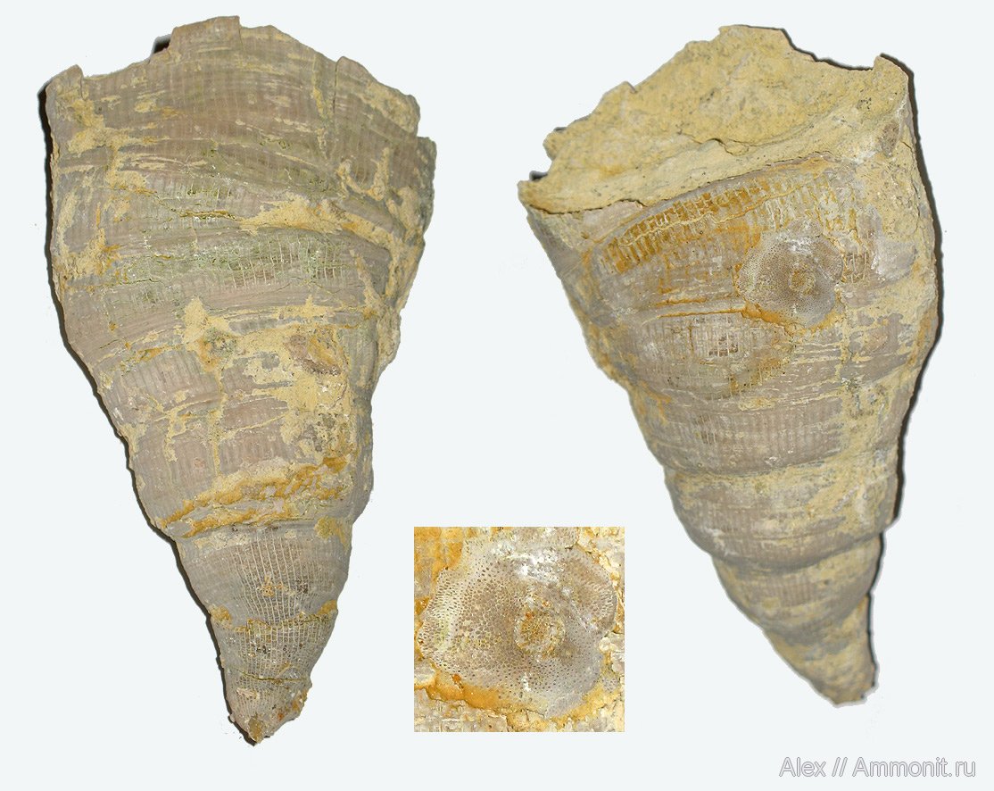 Ругоза Gshelia rouilleri с основанием мшанки Tabulipora maculosa. Высота коралла - 10 см, диаметр мшанки - 1 см.