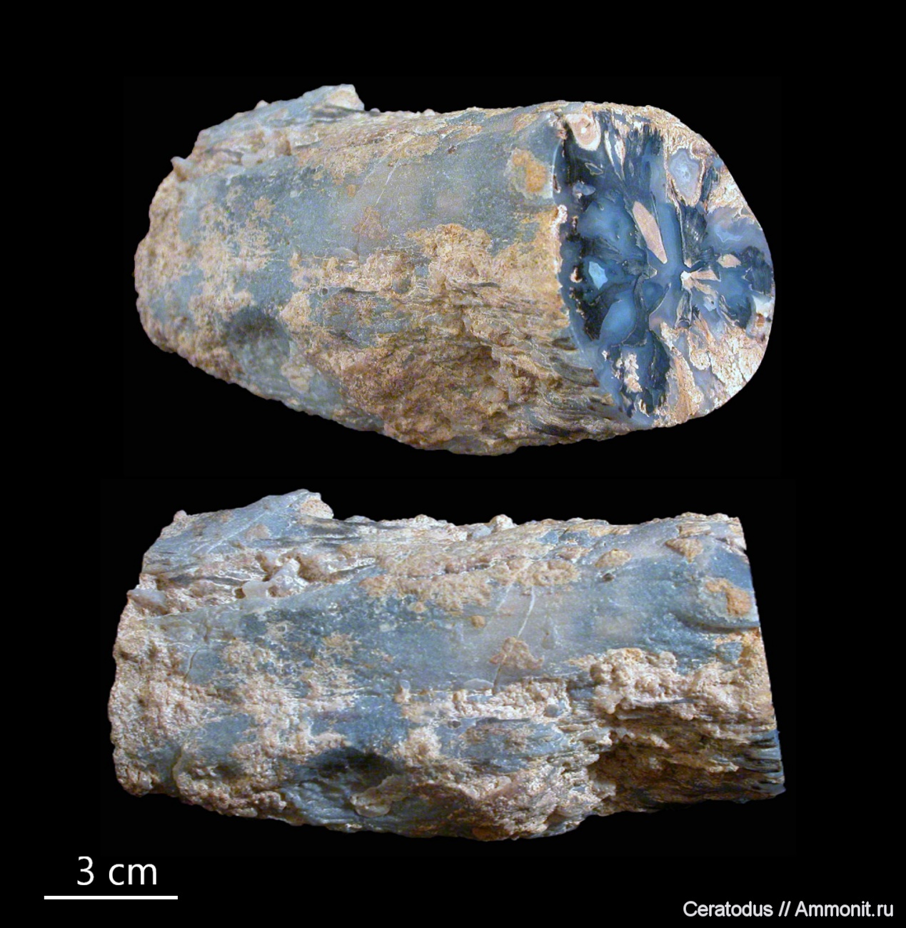 Практически полностью агатизированный ствол из местонахождения Eden Valley, штат Вайоминг. На полированном торце признаки древесины полностью отсутствуют, а на противоположном торце сохранились достаточно хорошо. Этот образец отличается от ранее представленных на Аммоните образцов из данного местонахождения тем, что агатом замещен весь объем ствола без образования на поверхности натечных формирований (свечное дерево), как, например, на этом образце.