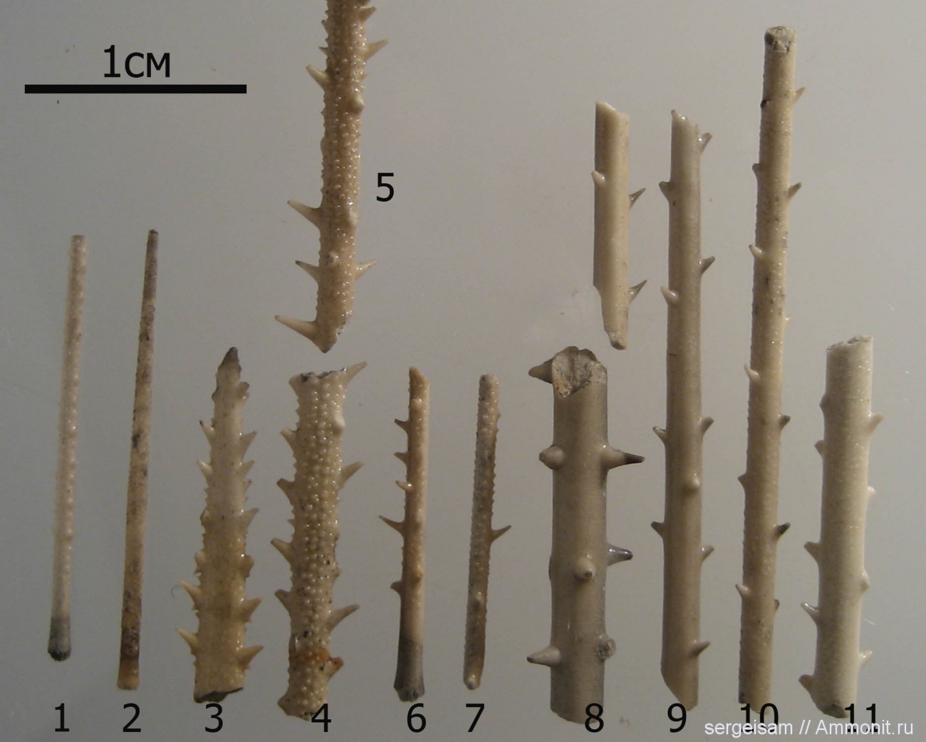 Вот мой набор: Иглы морских ежей. На самом деле там все плоские тоже с пупырышками, но не на всех они хорошо видны. Определял я их по Герасимову, вроде бы там все эти виды встречались именно в nikitini. | ||||||
