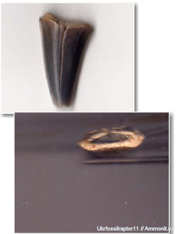 Зуб молодой акулы с ещё не сформировавшимся корнем. Снизу фото в поперечном сечении.