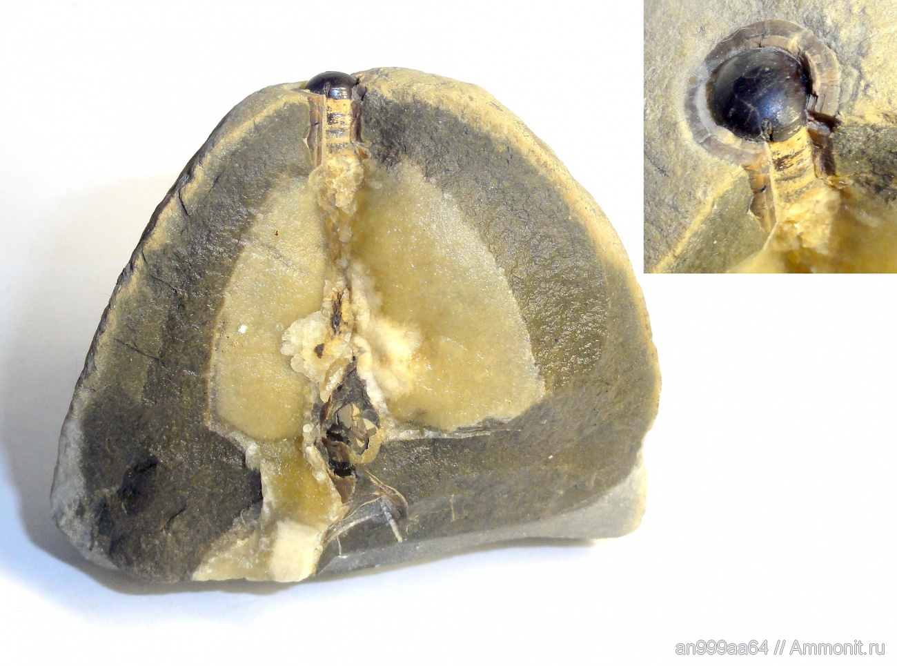 расколотая конкреция высотой 6,5 см., верхняя черная кнопка - без сомнения фрагмокон белемнита, вокруг него видно начало (или конец) ростра, а вот внизу? неужели окаменевшие останки мягких тканей белемнита? на мой взгляд конкреция образовалась вокруг чего-то принадлежащего белемниту. Спасибо Омару за подарок!