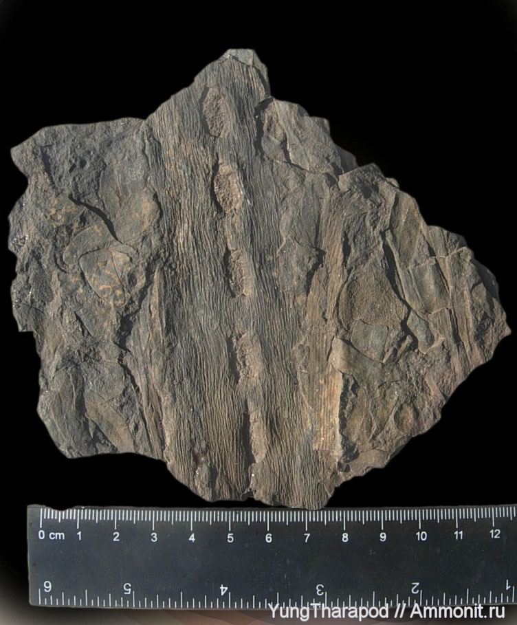 Покрытый морщинистыми бороздками отпечаток ствола обескоренной сигиллярии несет овальные листовые рубцы, расположенные строгой вертикальной линией на расстоянии около 0,5 см друг от друга. Отпечаток окружен более мелкими ветками и листьями Neuropteris gigantea f. arcuata. Правее заметен след подокруглого отпечатка (тригонокарп?).