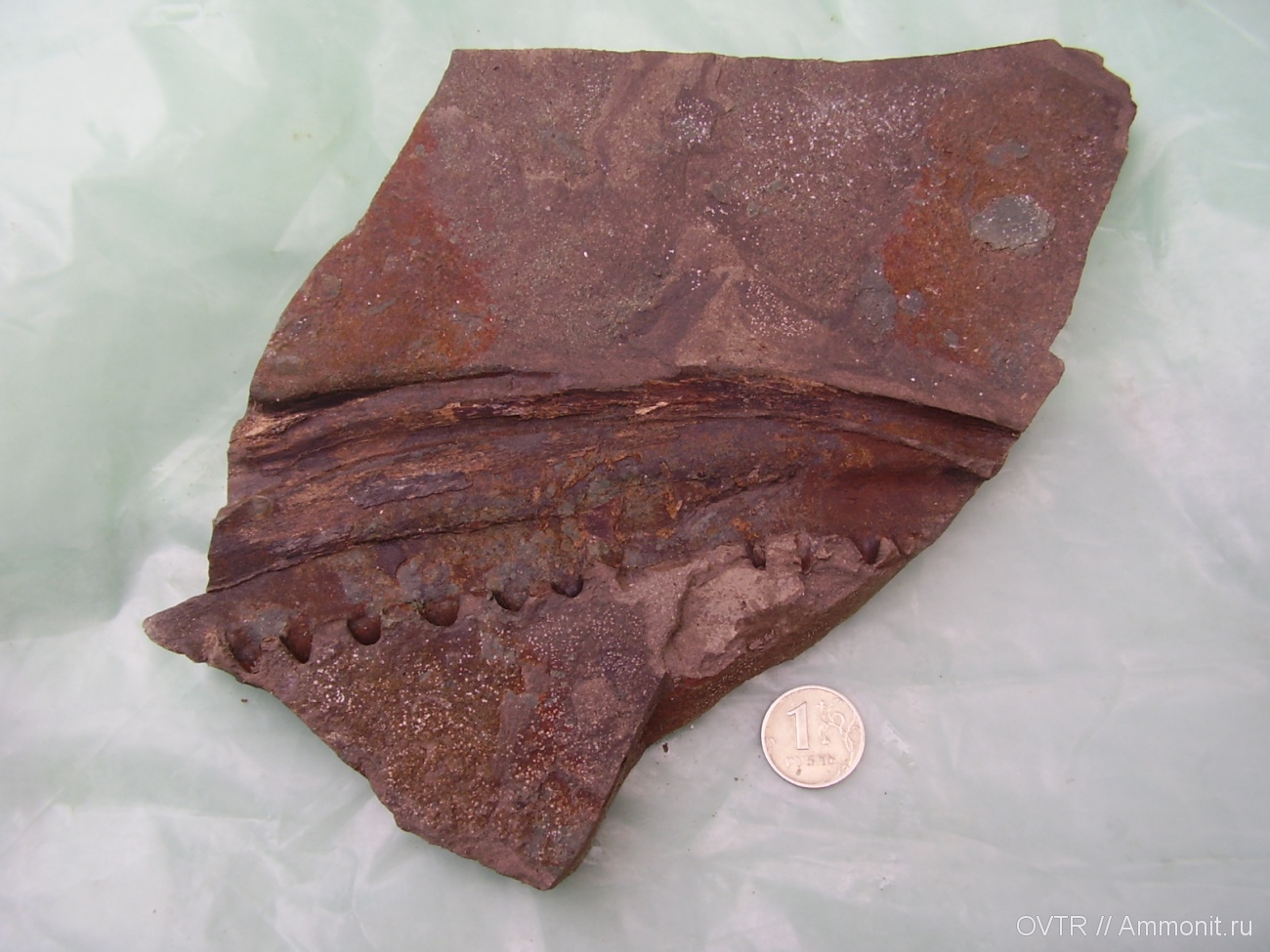 Контротпечаток челюсти некого животного, определить которого не удалось и в шутку названного "Пшехозавром". Известно, что зубы текодонтные, возраст - палеоген. Фото с места находки.