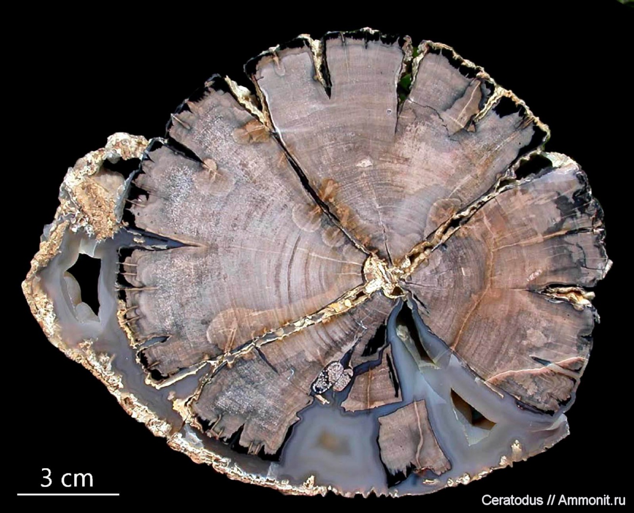 Окаменевшая древесина Pepperwood tree из местонахождения Crazy Horse, Eden Valley, штат Вайоминг. Видны ходы древоточцев, заполненные гранулами.