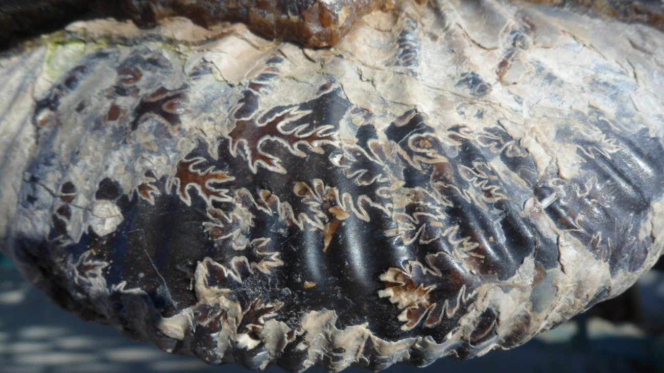 Черное - песчаник, скорее всего, коричневое - кальцит, белый раковинный слой - кальцит+арагонит | ||||||