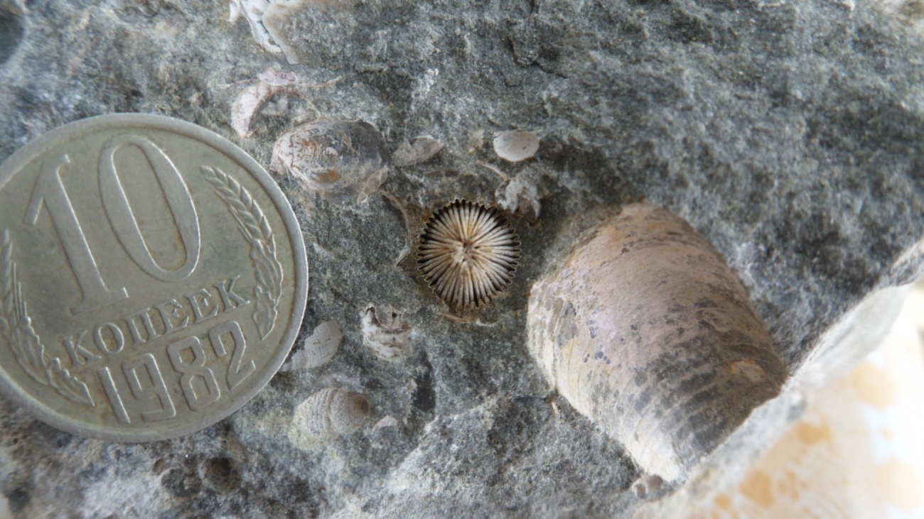 А слева круглое - очень похоже на 10 копеек, но как они попали в породу, которой сотни миллионов лет? Это что-то другое...