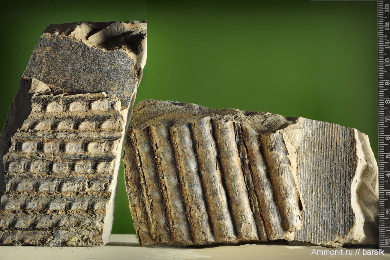 Фрагмент внешнего слоя коры сигиллярии и отпечаток ствола каламита. Разное освещение по разному может представить структуру поверхности одного и того же образца.