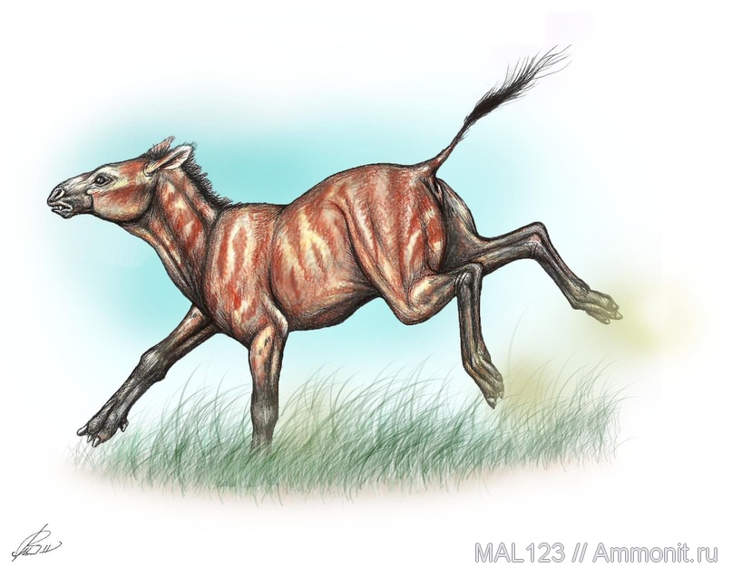 Нарисовано очень здорово! Только здесь гиракотерий очень похож на современную лошадь, а другие реконструкции отличаются. Там шея короче, а туловище длиннее. | ||||||