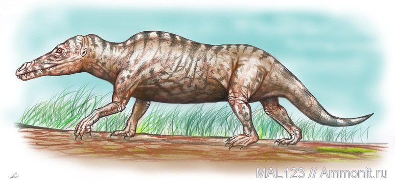 Поскольку,они,как считается, вели полуводный образ жизни,То я решил нарисовать свого амбулоцетуса идущим по болоту.Это, чтоб у зрителя не складывалось впечатление,что он жил исключительно в воде.Почти на всех реконструкциях,его почему-то изображают только в воде.Насчет лап, он у него были у него одинаковой длинны,просто предние были ниже расположены и потому казались длиннее. Действительно,надо было бедро не таким длинным рисовать.Сейчас исправлю. | ||||||