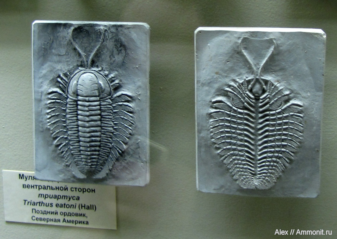 Вот так выглядел трилобит Triarthrus eatoni при жизни. Хотя это и не настоящая окаменелость, а лишь гипсовый муляж, я решил разместить его здесь в качестве справочной информации. Трилобиты крайне редко сохраняются с лапками и другими деталями тела, но в США в одном из местонахождений ордовикского возраста (Beecher's Trilobite Bed) встречаются пиритизированные трилобиты Triarthrus идеальной сохранности: фото. Видимо, эти слепки сделаны именно по этим находкам.