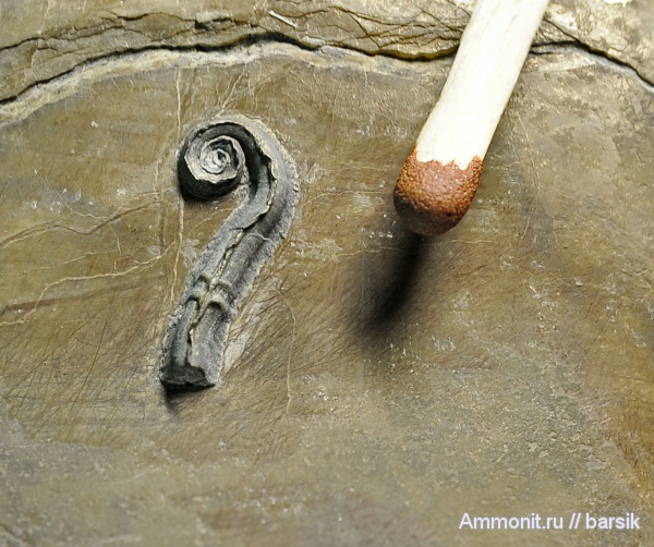На большом осколке аммонита расположилась серпула. Кроме продольного гребня у нее ещё поперечный узор из двух складок.