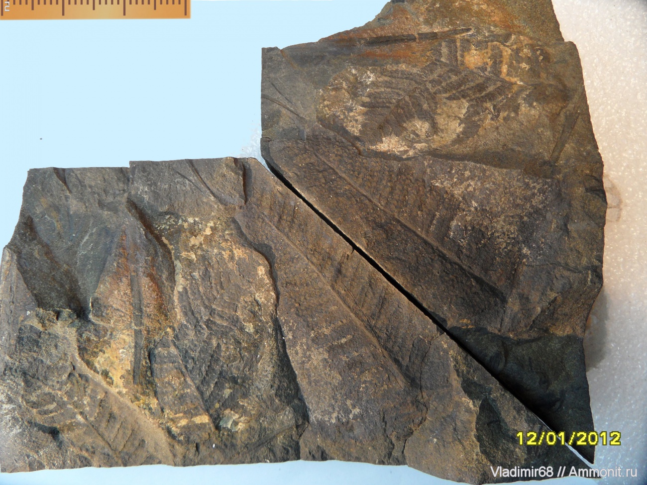 Зимние находки. Неожиданно удачно расколовшийся камень. Получились зеркальные отпечатки с обугленными фрагментами растений. Alsophillites nipponensis (Oishi) Krassilov