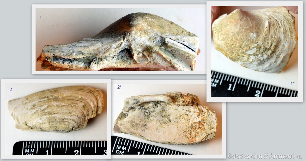 Фрагменты 2-х видов двустворок, встречающихся на карьере. Обычно весьма хрупкие раковины, чаще сохраняются глинистые ядра.