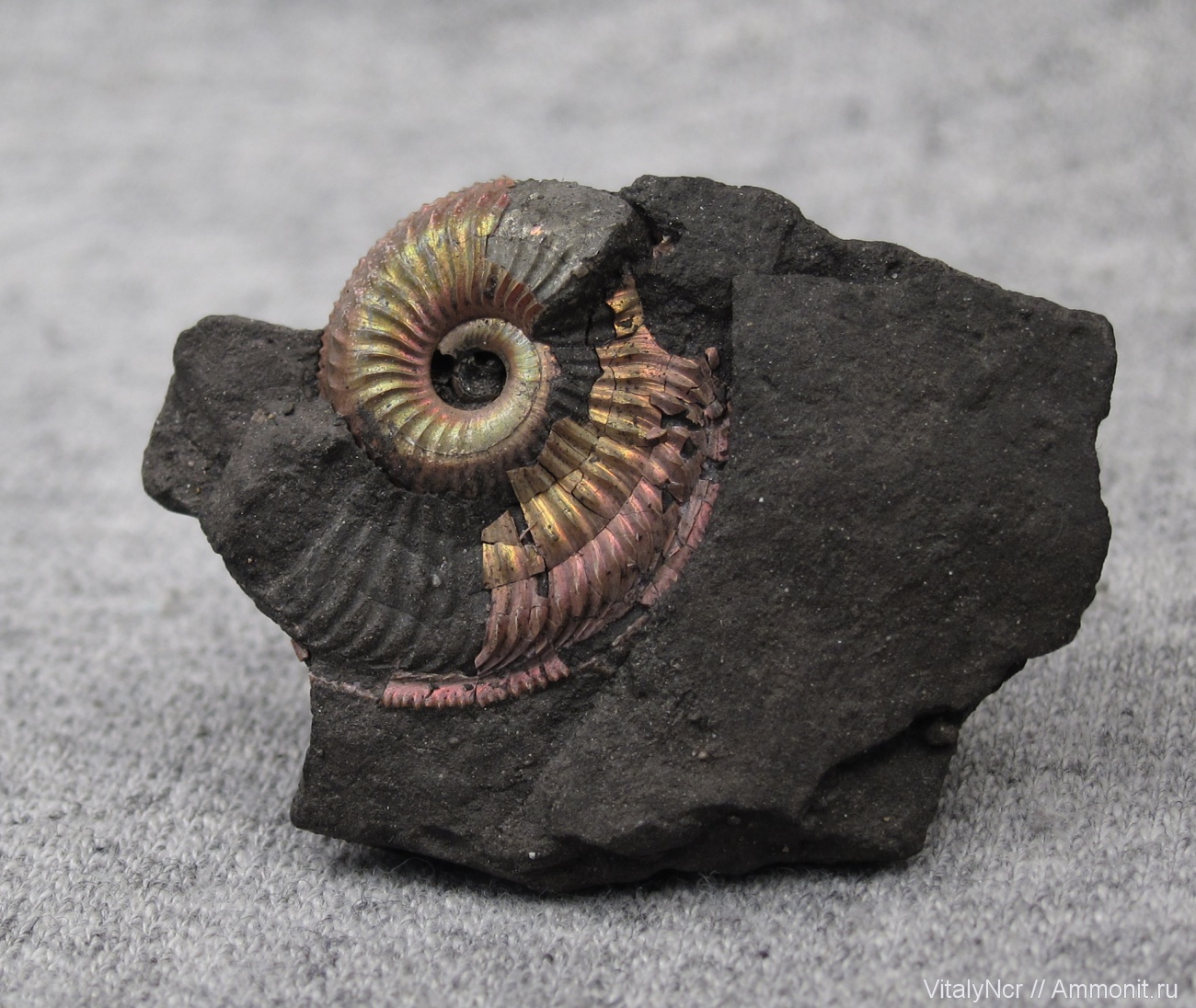 Аммонит Amoeboceras: частично пиритизован, частично - перламутровый отпечаток в глине