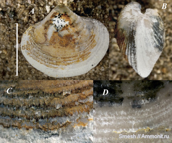 Мне посчастливилось найти целую раковину Phricodothyris с частично сохранившейся скульптурой поверхности раковины. Найдена она была в породах Подольского горизонта. На фотографии A - вид раковины со стороны брюшной створки; B – вид сбоку; C – крупным планом остатки скульптуры поверхности на брюшной створке; D – скульптура поверхности спинной створки. Длина вертикальной черты - 1 см. Конечно, то, что мы видим на части С, довольно скудные остатки, но... Сами целые раковины встречаются нечасто, а уж со скульптурой...