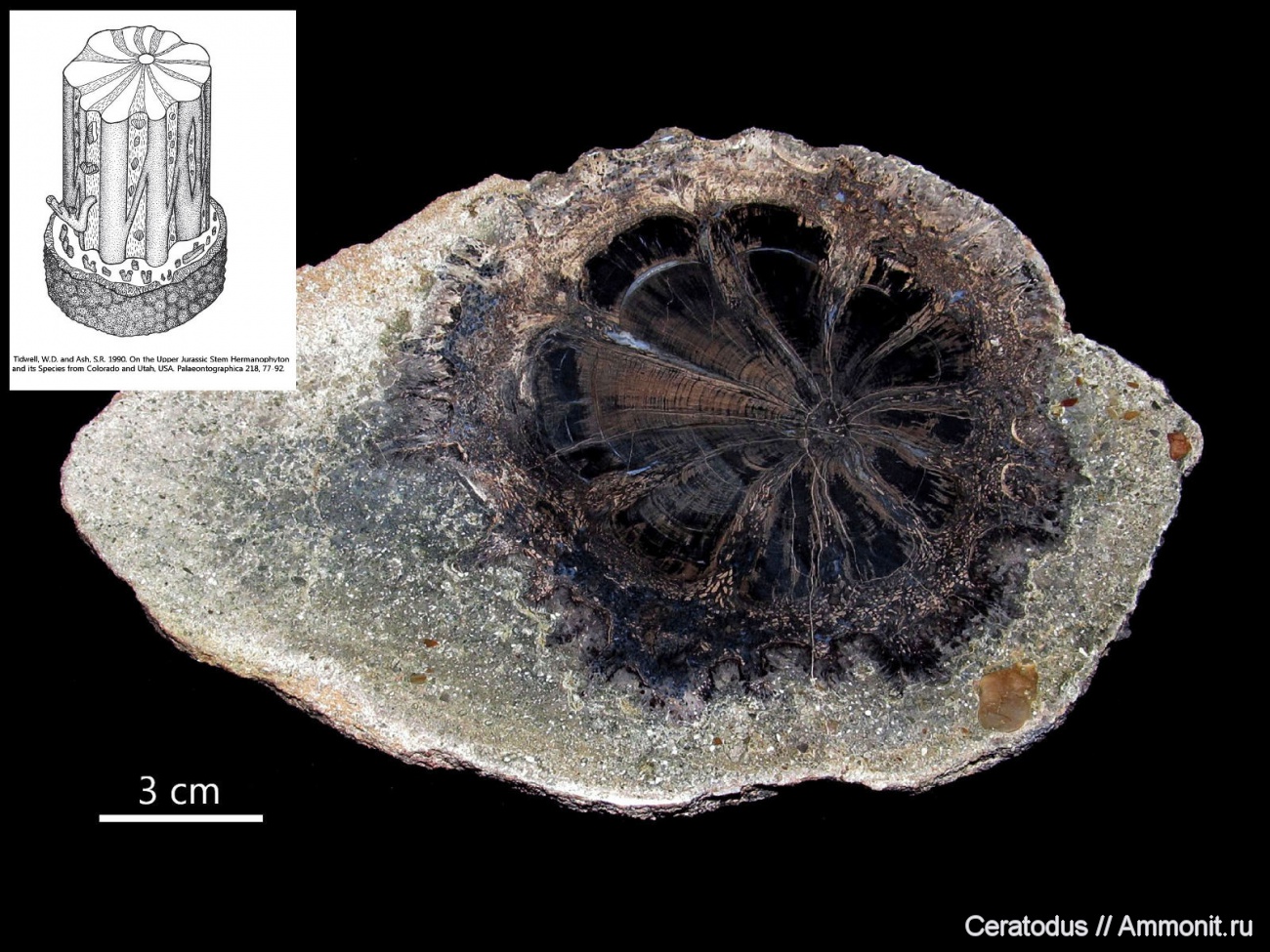 Данный экземпляр имеет уникальную сохранность периферийной части ствола, окружающей радиально расположенные лопасти ксилемы, разделенные первичными лучами. В периферической части, состоящей из кортекса и раментума, видны проходящие через них следы оснований листьев (см. схему ствола на врезке). Таксономическое положение Hermanophyton'а неясно, т.к. до сих пор не найдены какие-либо следы других частей этого редчайшего растения. Большинство палеоботаников склоняется к тому, чтобы отнести Hermanophyton к птеридоспермам. Некоторые косвенные данные указывают на то, что это растение обладало лианообразным стволом. Размер образца близок к максимальному для этого вида. Местонахождение East McElmo Creek (Morrison Formation), штат Колорадо. Недавно был описан образец этого растения, найденный в мелу Германии, о чем в одном из постов уже упоминал уважаемый Andreas.