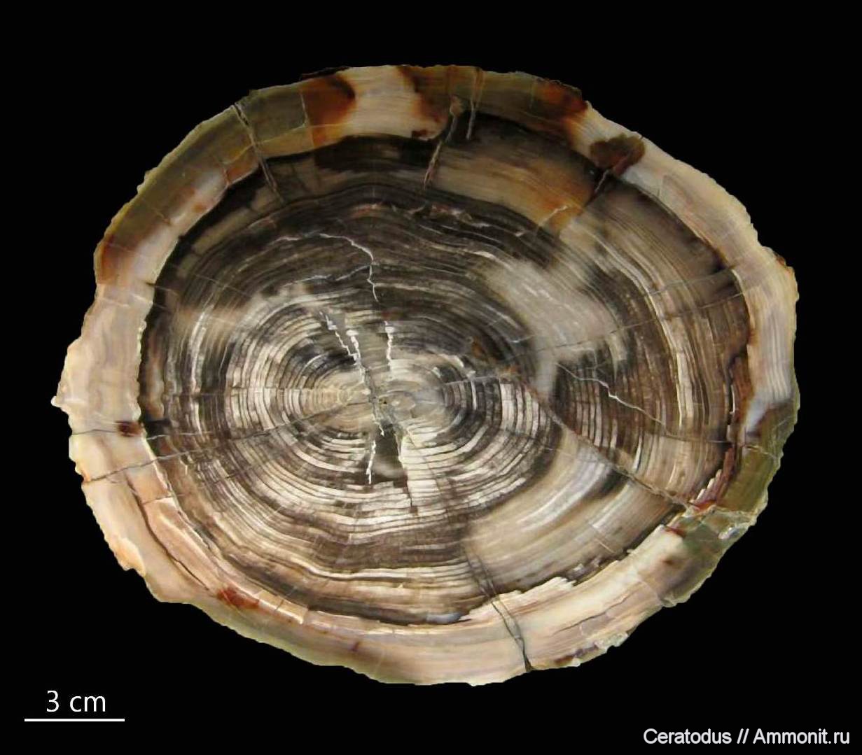 Образец с хорошо сохранившимися годовыми кольцами. Найден в 60-х годах прошлого века в местности под названием HORSE HEAVEN HILLS, штат Вашингтон.