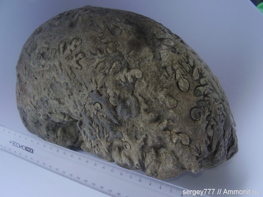 Крупный юрский аммонит Tragophylloceras из Приборжавского карьера. Размер 25 см, толщина раковины 15,5 см, смотрите на фото.Когда его очищал от мергеля он треснул на фотографии видна трещина, внутри аммонита оказалась брахиопода, смотрите в правом углу на фото, как она могла попасть внутрь аммонита.