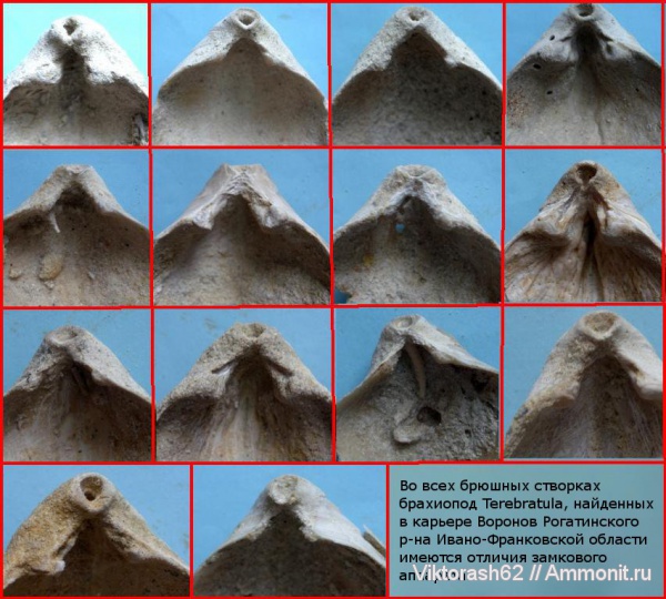 Во всех найденных брюшных раковинах брахиопод Terebratula sp.выявлены четкие различия в строении замочных (или замковых, как точнее?) аппаратах, что позволяет сказать, что их внутривидовая изменчивость разнообразна и каждая особь отличается от другой, как у людей отпечатки пальцев. Все брахиоподы найдены в одном слое и в одном карьере Воронов.