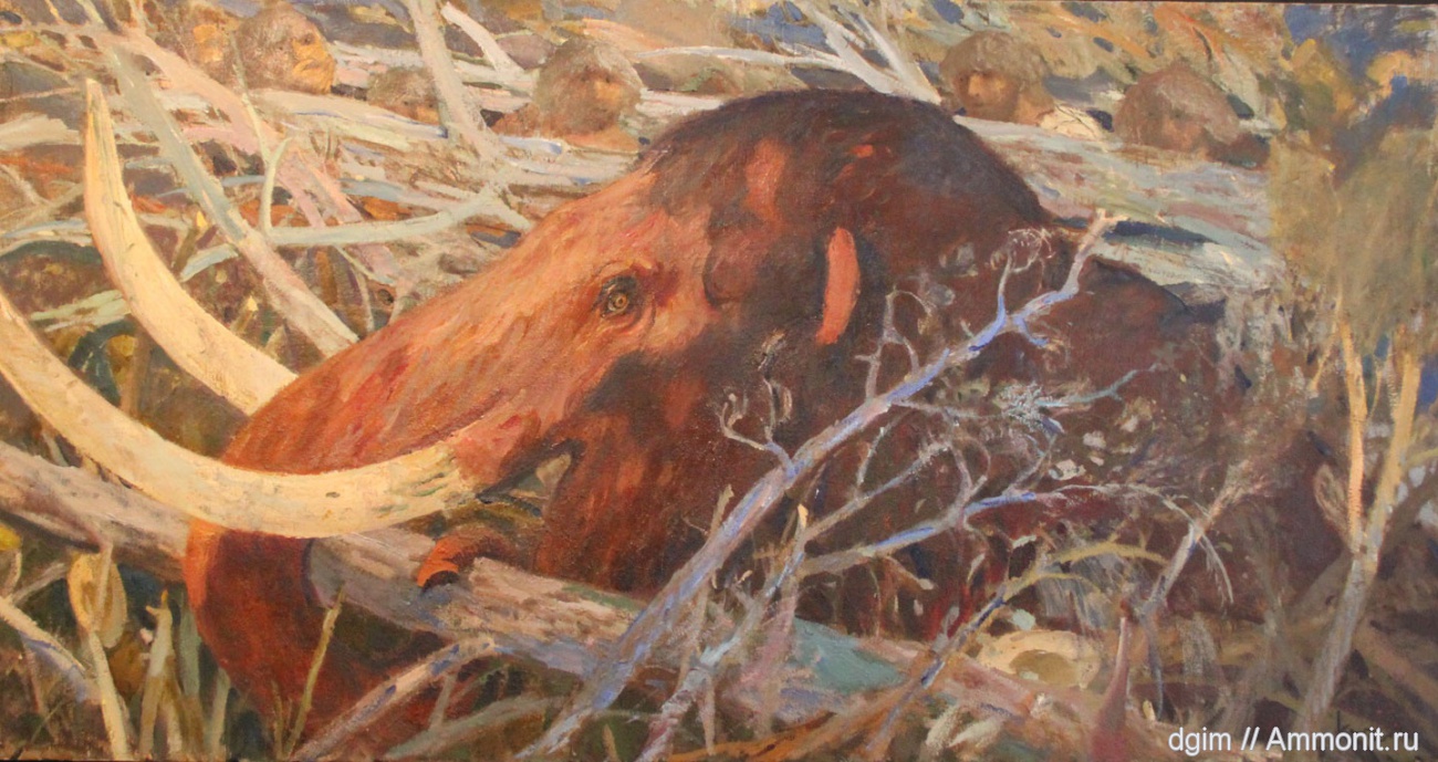 Мамонта загнали в заболоченную ложбину, замаскированную сучьями и стволами деревьев. Люди ждут, когда зверь обессилит от потери крови...