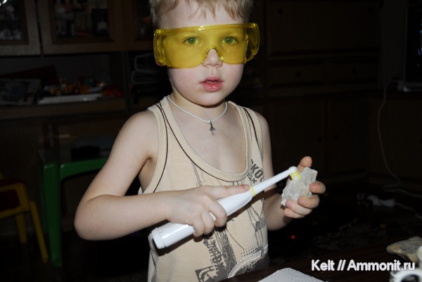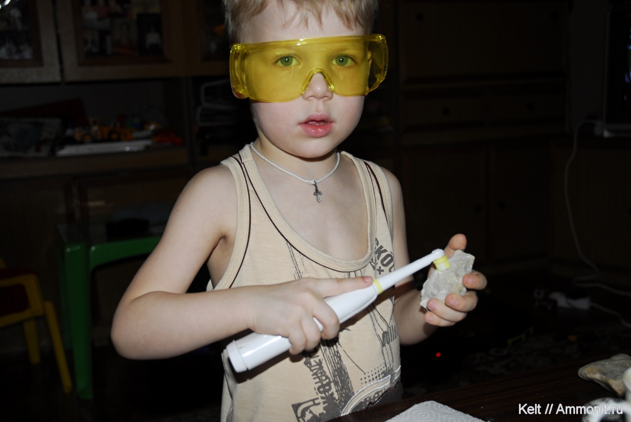 Вечером фотографировал несколько окаменелостей, чтобы знать как они выглядели до того как я их своим “профессиональным” препарированием испортил и оставил их на столе. С утра меня разбудил сын и говорит: “Пааап”, а что они у тебя такие грязные, почему ты их не почистил? "Сынок, их нужно еще препарировать". Ненадолго ушел и вернулся со своей электронной зубной щеткой. Попросил найти его рабочие очки и заменил насадку. Что было дальше уже видно из фото. Я дома никогда не чистил окаменелости, бормашина у меня в институте, он никогда не видел меня как я с ней работаю. Как догадался??