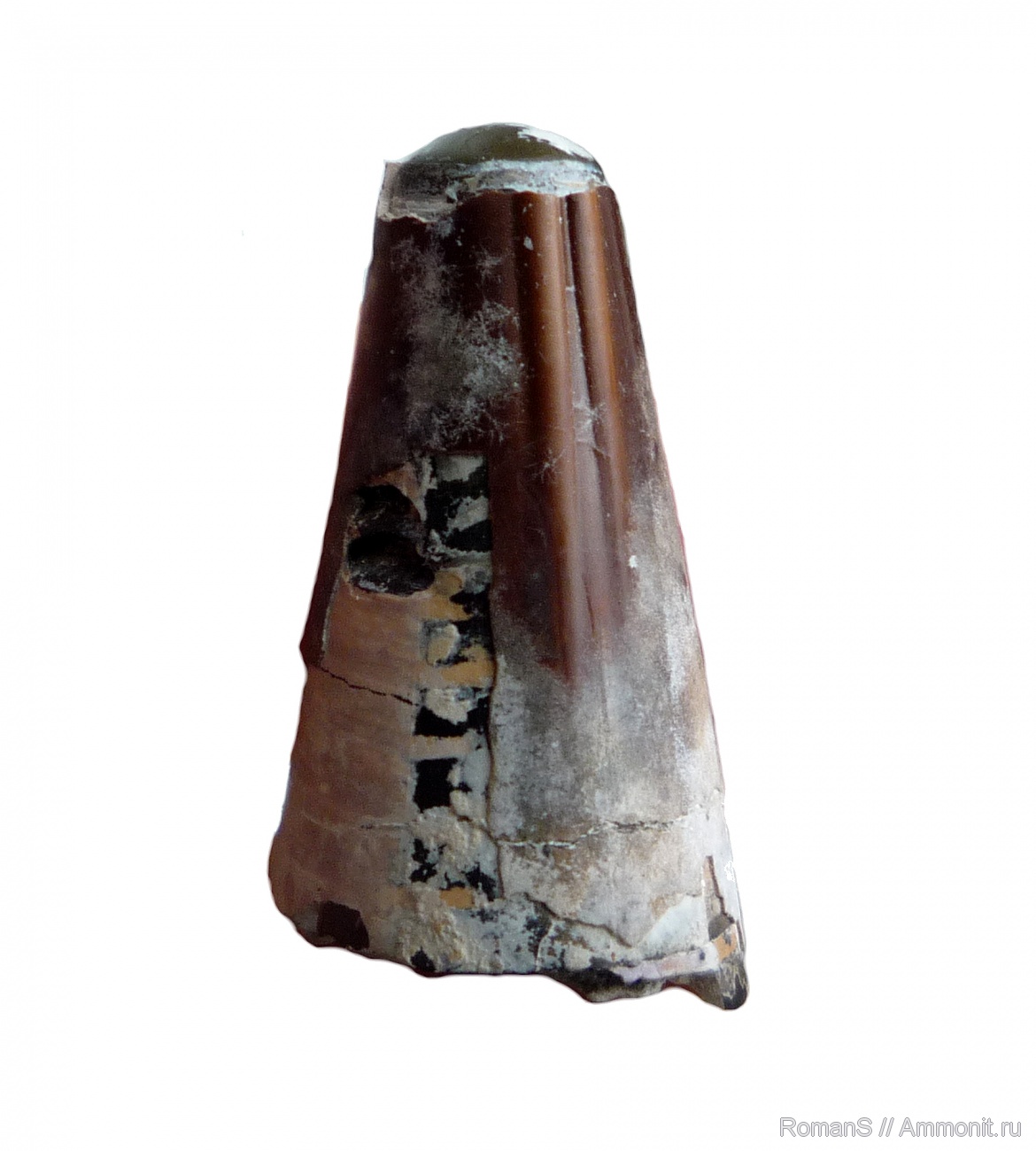 Пиритовый фрагмокон белемнита с сохранившимся перламутровым слоем.