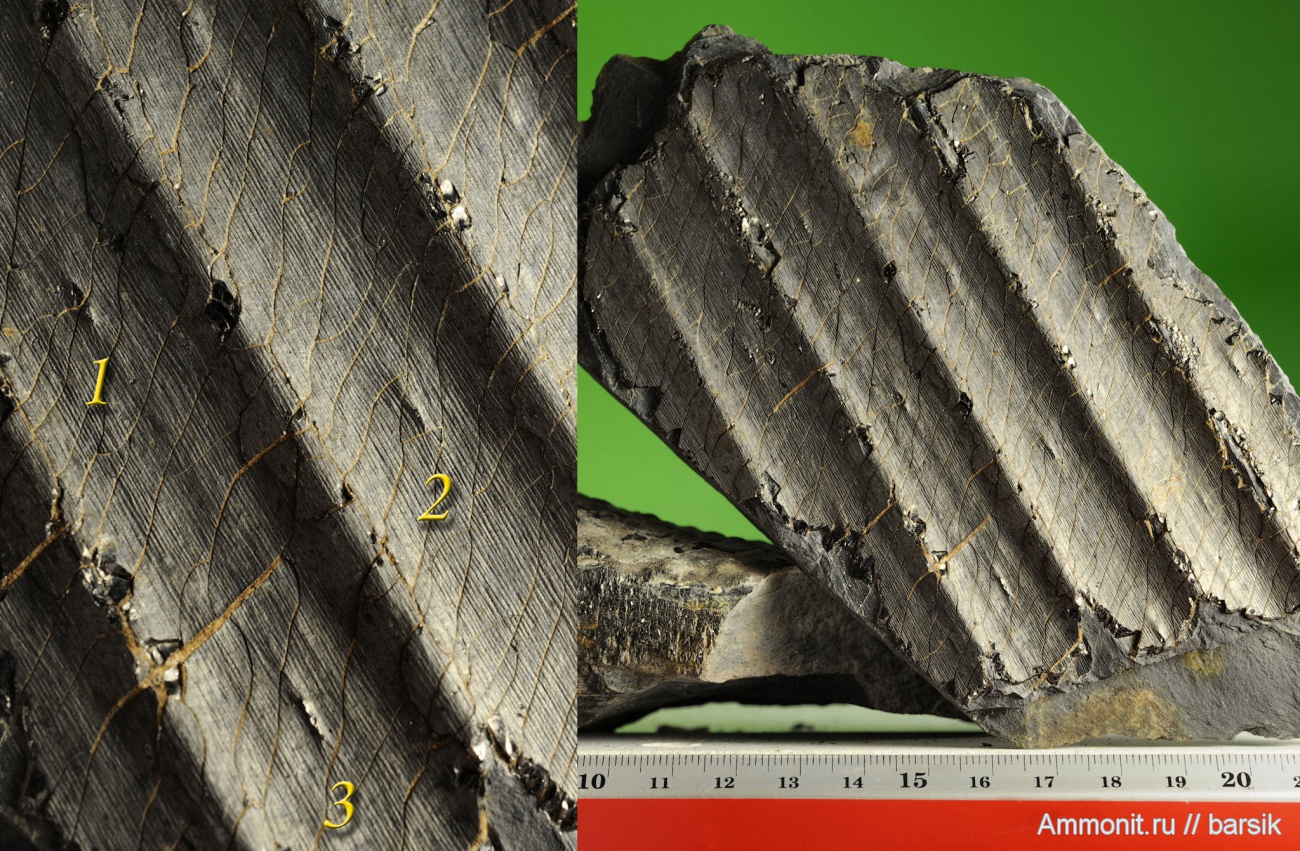 Отпечаток (негатив) внутреннего слоя коры без листовых рубцов, сохранились лишь парихны(1,2,3).