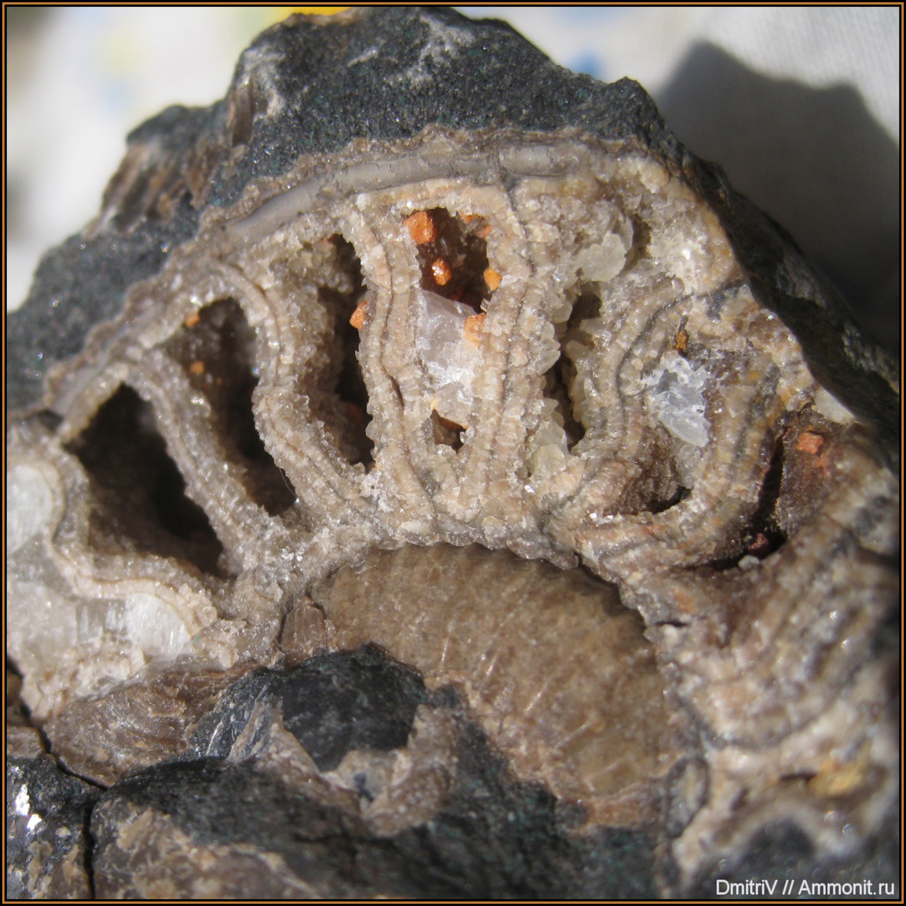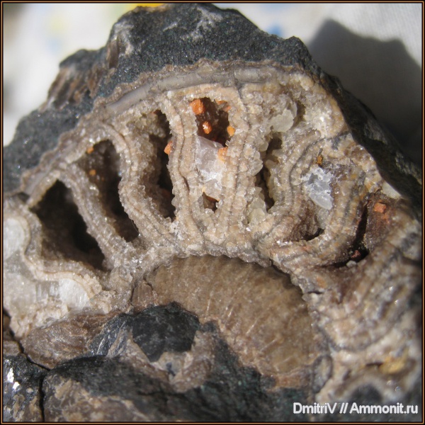 На аммоните видны остатки сифона и перегородки камер с кальцитом.