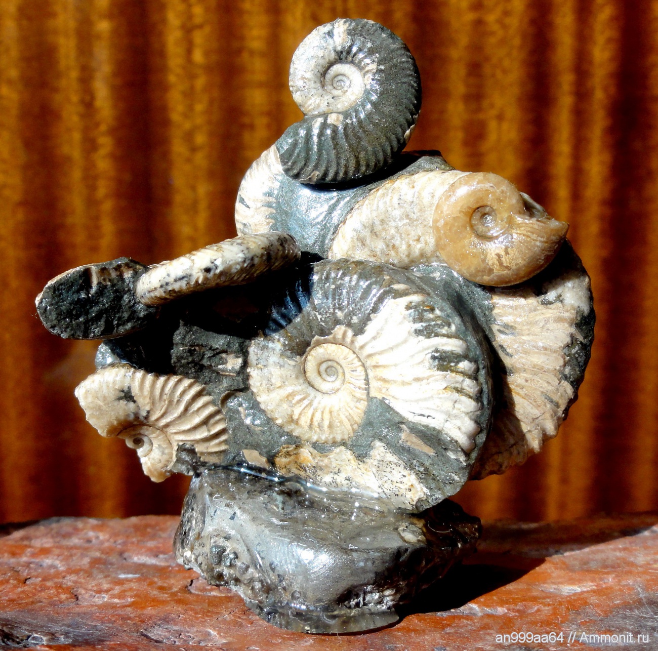 композиция Дагестанских аммонитов полученная в собственность благодаря Уважаемому Омару, мах размер верхнего 2,3 см, все они (кроме самого верхнего и рыжего) так и были в таком же положении в одном камне, убрал вокруг них лишнюю породу, в ходе обработки у одного обнажилось устье фото чуть сверху фото сзади