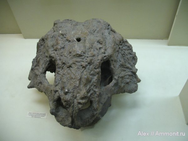 Череп парейазавра Scutosaurus karpinskii. Парейазавры жили в пермском периоде, в том числе и на территории России. Считается, что по образу жизни эти крупные травоядные напоминали бегемотов. На черепе видно отверстие для теменного глаза.