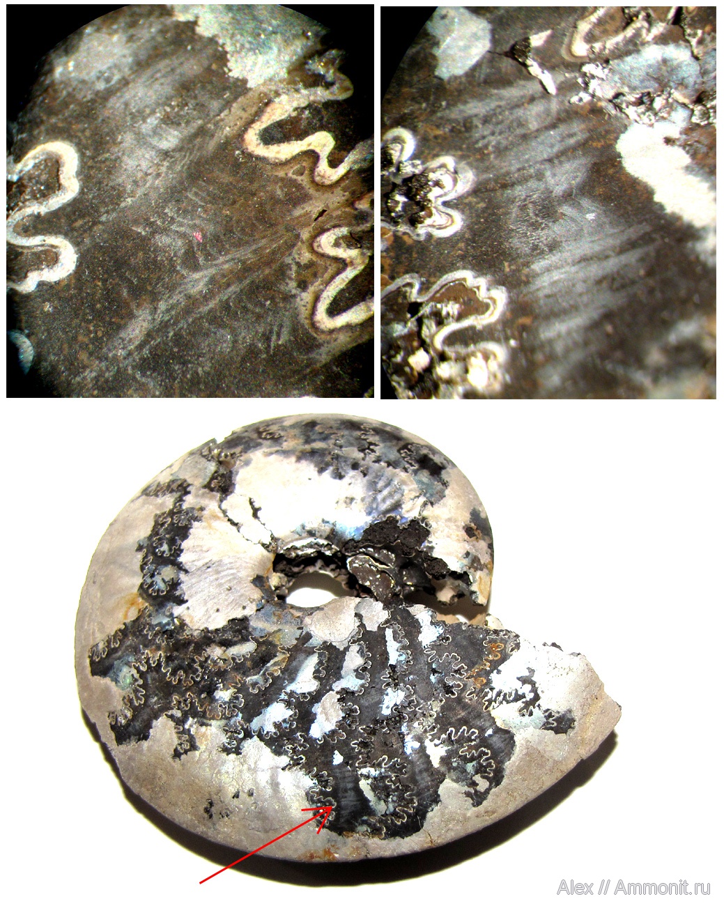 На этом Garniericeras catenulatum из Еганово диаметром около 6 см хорошо видны такие образования. Для невооруженного глаза они выглядят как перистые перламутровые полосочки между лопастными линиями, однако под микроскопом или даже увеличительным стеклом видна их структура, состоящая из продольных и поперечных полос, в общем повторяющих структуру лопастной линии аммонита.