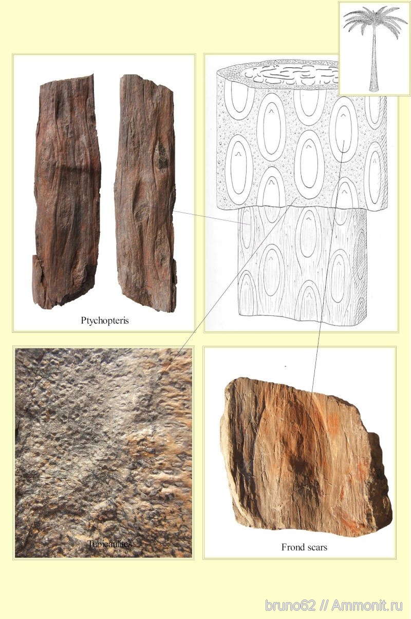 Ptychpteris ,Here is a reconstruction of Psaronius, with its sleeve of adventitious roots, the area covered roots are known as morphogenus : Tubicaulites, the trunks as they are completed are described under the name : Caulopteris which phyllotaxy is spiral. The inner mold is know as morphogenus