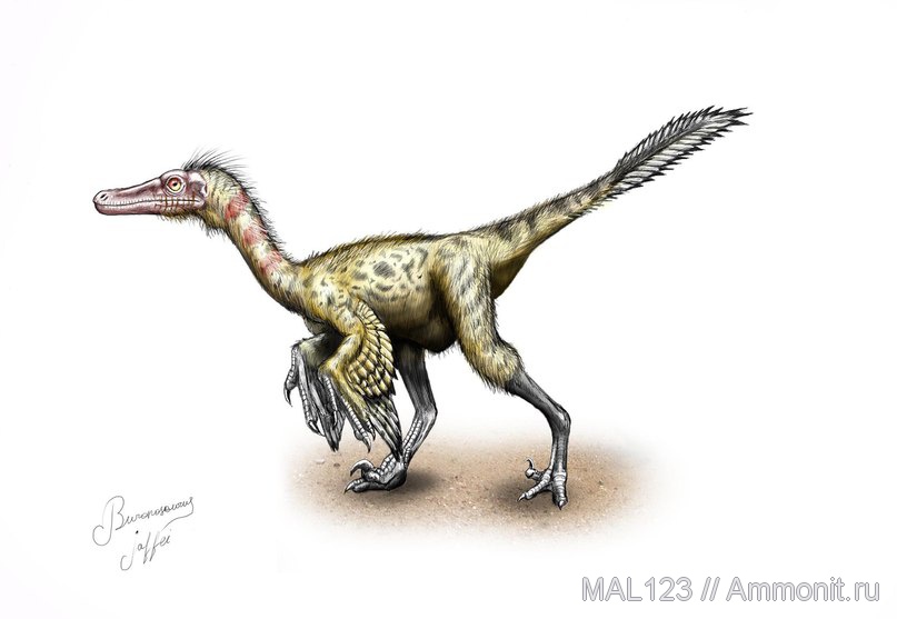 Монгольский троодонтид,открытый в 2000 году.Я нарисовал ему на шее красные полоски,которые как-бы свидетельствовали о половозрелости самца.