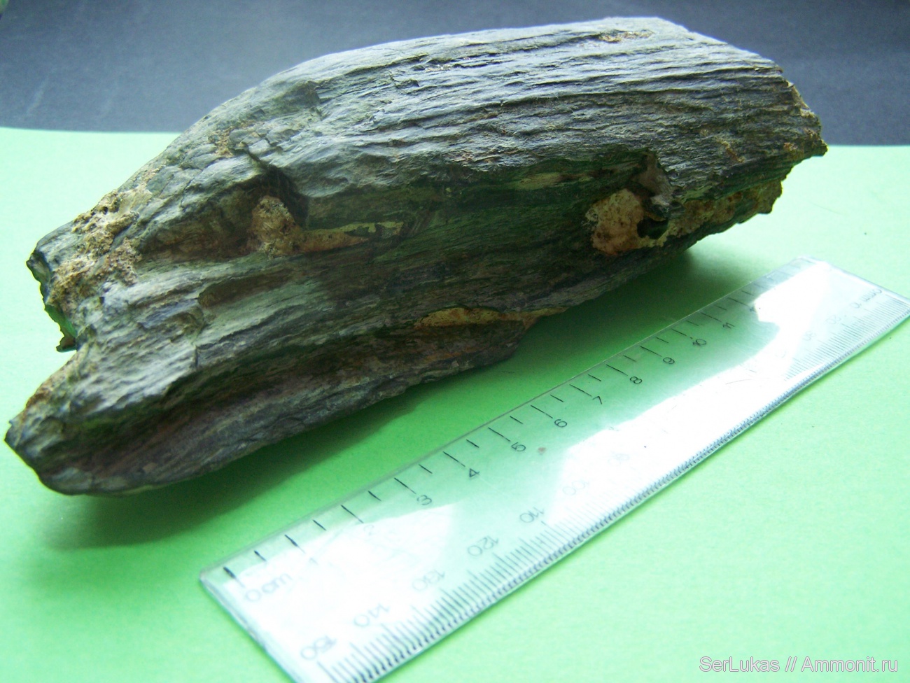 Кусок окаменелой древесины, найденный в пойме р.Случ Ровенской области Украины, предположительно эоценового возраста (может быть и позднемелового). Тип фоссилизации - кремнизация.