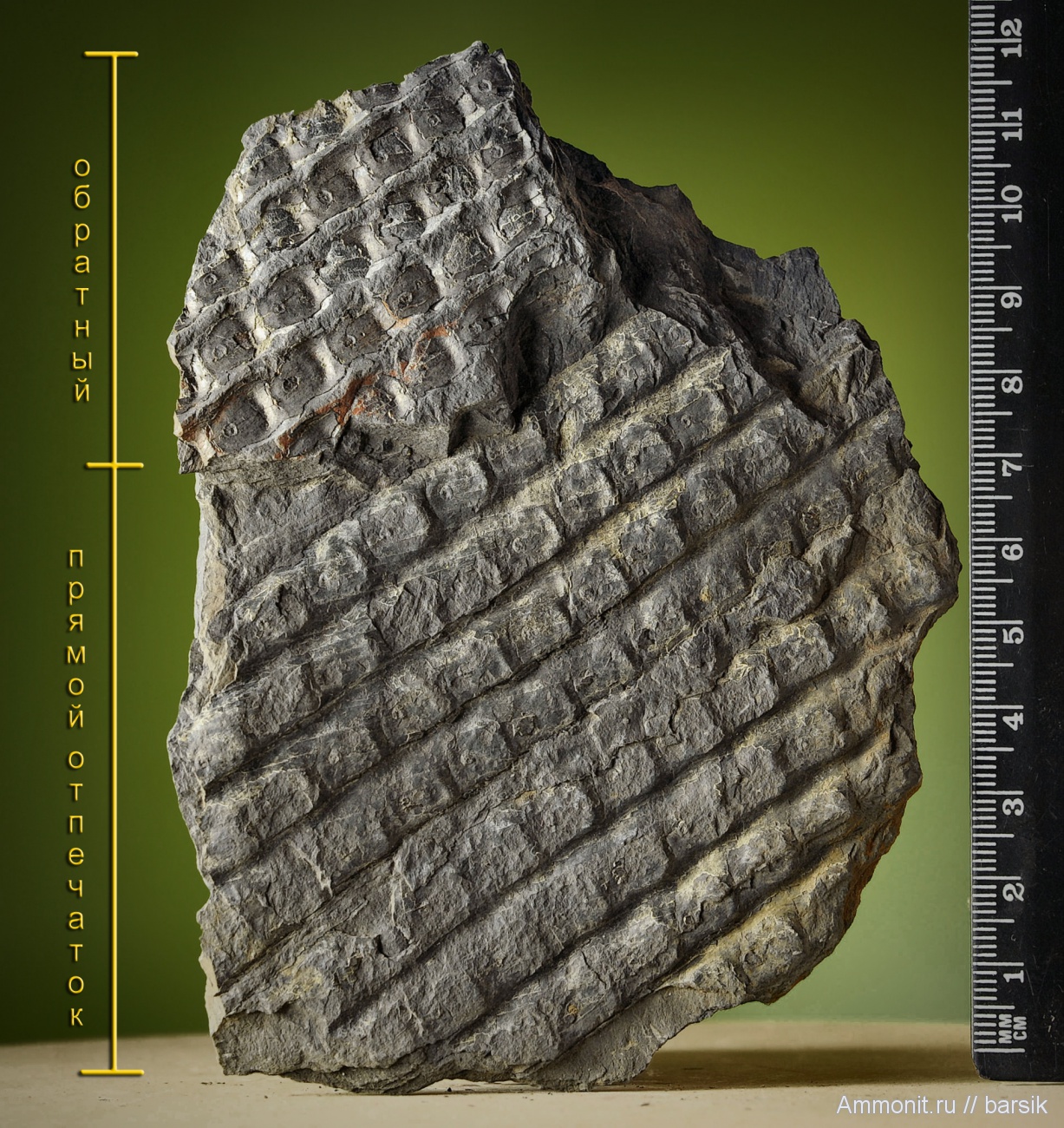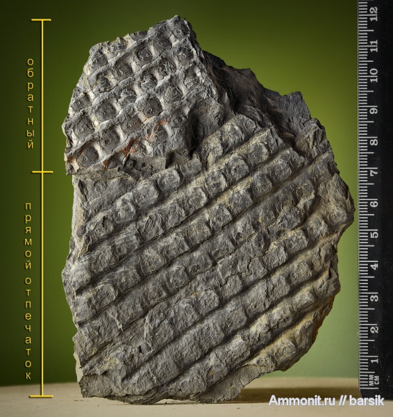 На одном камне и на одинаковом уровне по соседству оказались и позитивный и негативный отпечатки внешнего слоя коры сигиллярии. Наверное большой кусок коры разломало на части и перевернуло некоторые фрагменты при захоронении на дне.