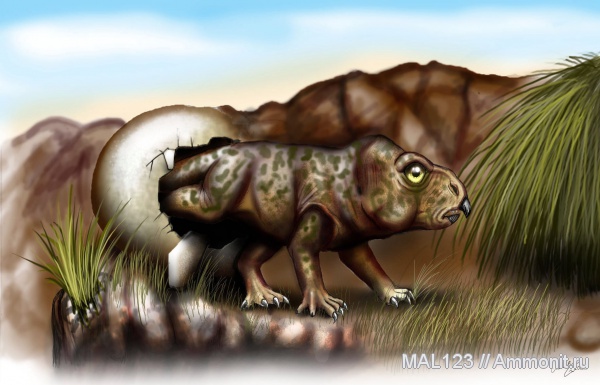 Детеныш протоцератопса , только что вылупившийся из яйца.Подобная окраска позволяла детенышам скрывается от хищников в густой растительности.
