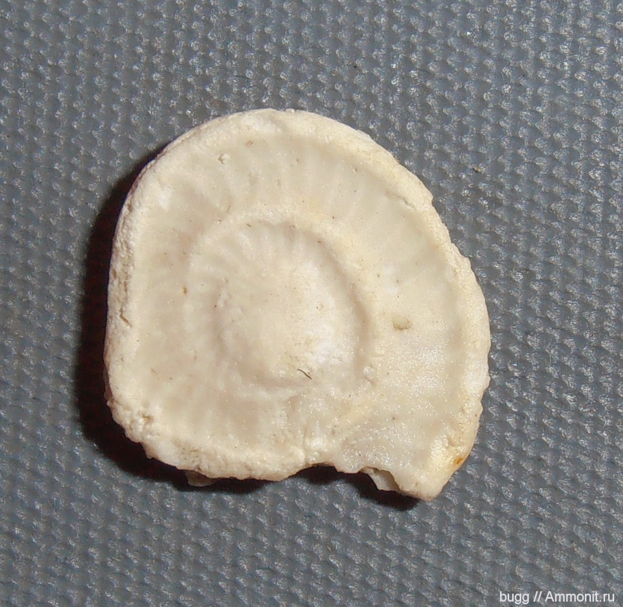 Похоже на Меловой нуммулит, в чём нет ничего удивительного, ибо они принадлежат к отряду Nummulitida. Только вот у Operculina высота оборота с третьего начинает резко увеличиваться, а здесь этого не видно. Может быть этот участок как раз и обломился. Примерно постоянная высота оборота сохраняется у Assilina. | ||||||