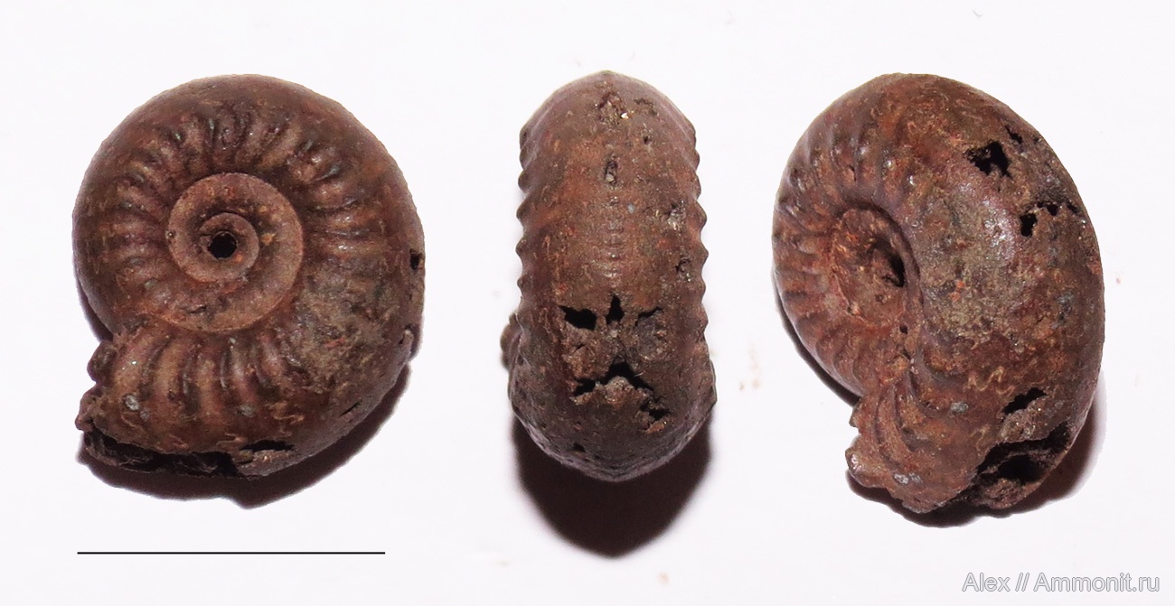 Маленький аммонит Amoeboceras zieteni (длина масштабного отрезка 1 см)