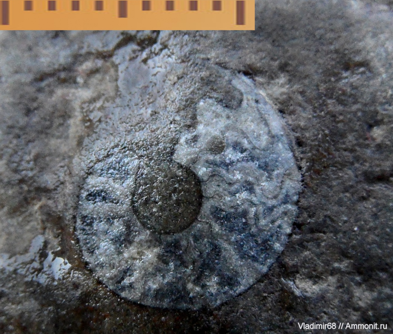 При промывке найденных перспективных (с нашей точки зрения) камней случайно увидел вот такой вот аммонитик. Непонятно он как-то начинается, без пупка? Размер 8мм замещение –минерал кристаллы белого (прозрачные) цвета. Найден на побережье Уссурийского залива.