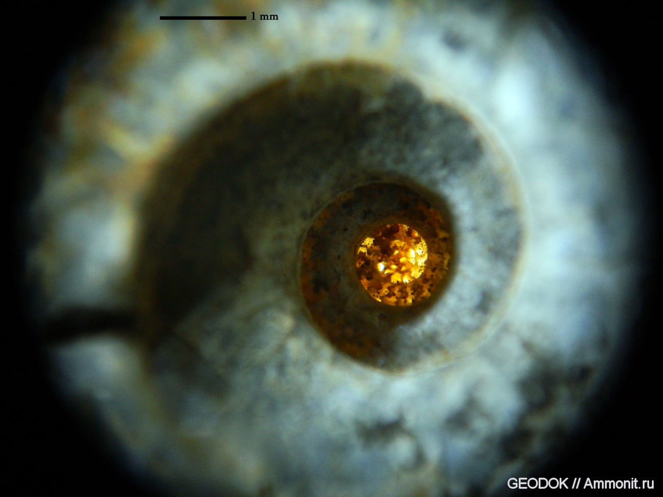 *При съемках протоконхов, я столкнулся с одной технической проблемой, решить которую крайне тяжело. Установка, для макросъемки позволяет делать достаточно качественные макроснимки, но в таких моментах как здесь, возникают проблемы света. При приближении образца к объективу, "теряется" свет, закрываемый оборотами аммонита. Так как фотоаппарат не имеет ручных настроек, это превращается в проблему.