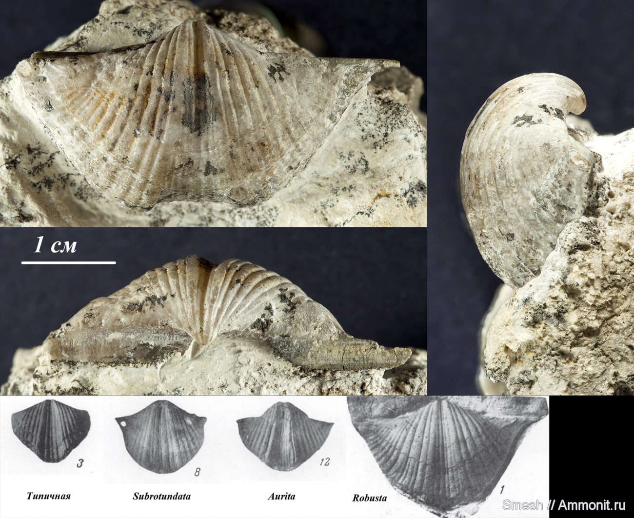 Alexq в своём комментарии высказал предположение, что это «брахитирина клейни в одной из ее ипостасей». Каковы же есть «ипостаси» этой брахитирины? Alexq называет их: аурита, субротундата (aurita, subrotundata). Их фотографии приведены в [1] и в нижней части представленного здесь фото. В [1] выделена также «типичная» B. kleini, которой прекрасно соответствует моя ранее опубликованная фотография Целая раковина Brachythyrina kleini . Но в [1] приведена фотография ещё одной брахитирины, B. robusta. На мой взгляд, она в точности соответствует найденной мною створке. На фото из [1] прекрасно видна даже отмеченная мною для Прижизненное повреждение на створке раковины Brachythyrina kleini ярко выраженная стадийность роста раковины.