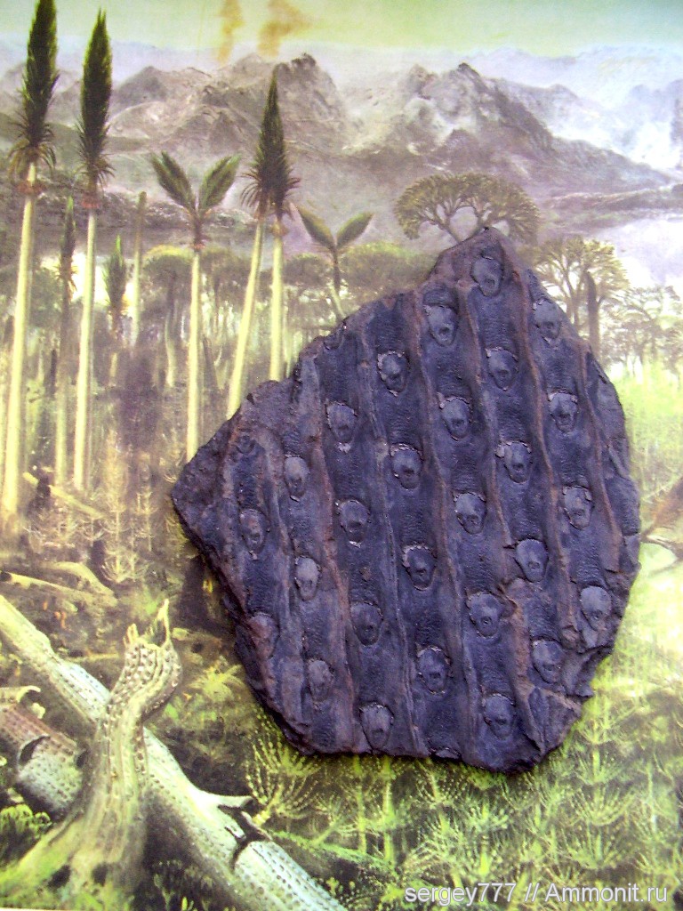 Фоном послужила илюстрация о карбоне с книги «История жизни на Земле», автор Зденек В.Шпинар, художник Зденек Бурнан, 1977 г, Прага. Это моя первая книга которою мне подарил мой отец в 11 лет. Размер образца 12,3 см